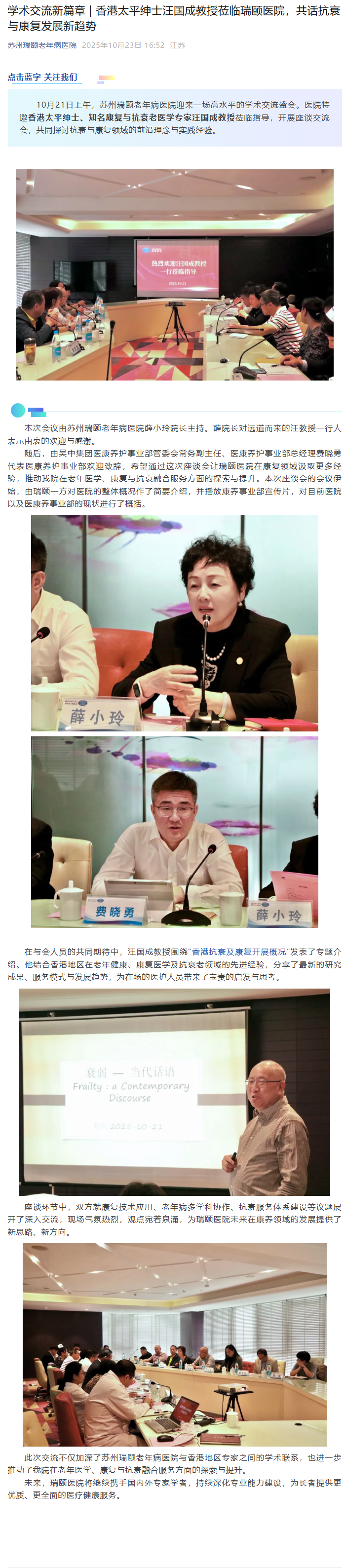 学术交流新篇章 | 香港太平绅士汪国成教授莅临瑞颐医院,共话抗衰与康复发展新趋势
